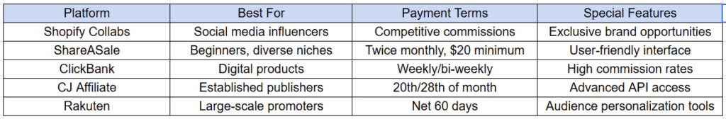 Table: Affiliate Platform Quick Comparison